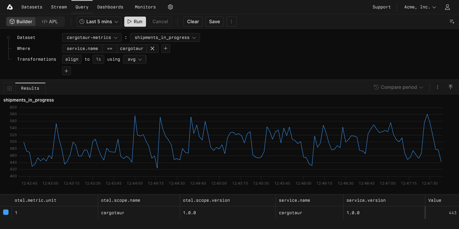 The builder supports all the core operations you need for metrics analysis, from simple filtering to complex aggregations. Whether you’re tracking request rates, analyzing latency distributions, or monitoring system health, the visual interface makes it straightforward to extract insights from your metrics data.
